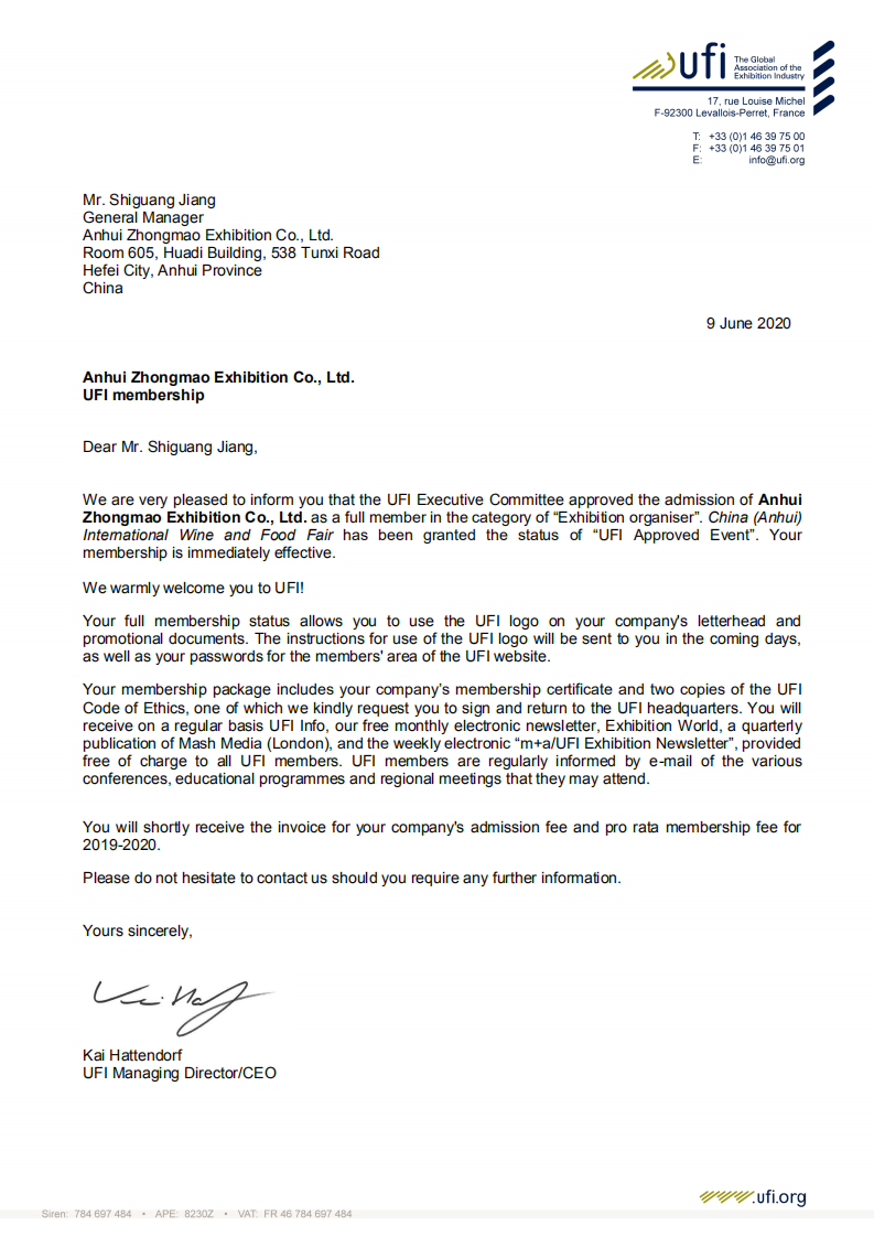 2020年6月9日,UFI(全球展覽業(yè)協(xié)會(huì))巴黎總部傳來喜訊:中法合資高博中貿(mào)會(huì)展在山東、江蘇、安徽主辦的CNFE全國食品博覽會(huì)(濟(jì)南)、CNWFF中國(南京)國際糖酒食品交易會(huì)、CAWFF中國(安徽)國際糖酒食品交易會(huì)三展同時(shí)通過UFI(全球展覽業(yè)協(xié)會(huì))認(rèn)證,同時(shí)高博中貿(mào)會(huì)展在山東、江蘇、安徽三個(gè)子公司也通過UFI評(píng)審委員會(huì)的表決,分別正式成為UFI(全球展覽業(yè)協(xié)會(huì))會(huì)員單位。通過UFI認(rèn)證,是國際會(huì)展行業(yè)對(duì)主、承辦單位組織辦展能力的肯定,對(duì)展會(huì)在國際化、專業(yè)化、品牌化運(yùn)營方面的充分認(rèn)可。借助UFI認(rèn)證展會(huì)的權(quán)威和影響,努力提升展會(huì)平臺(tái)新高度,助推會(huì)展經(jīng)濟(jì)的快速發(fā)展。