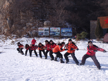 來到滑雪大廳,第一個步驟就是換裝:換上滑雪服和滑雪鞋,感覺自己就像是太空人,一切都是那么的新奇;滑雪裝備準(zhǔn)備齊全之后,我們進(jìn)入了滑雪場地,剛剛開始感覺舉步維艱,仿佛一不小心就會摔倒在地,但慢慢的我們就會滑上一小步了,我們?yōu)樽约旱男⌒〉倪M(jìn)步而歡呼雀躍。爾后,我們在杜總和劉總的帶領(lǐng)下爬上了雪坡,在掌握了一些滑雪技巧之后,我們開始陸續(xù)的往下滑,去體驗俯沖的刺激、摔倒的驚險和同事間互相幫助的喜悅,在經(jīng)歷了不計其數(shù)的摔倒、爬起再摔倒的循環(huán)后,每個人都掌握了滑雪的基本技巧,其中,劉總、張存、李萍作為技巧最好的代表,每一次的俯沖都贏得了大家的掌聲和贊嘆?;┚拖袷亲稣褂[,剛開始感覺很陌生,慢慢的掌握了技巧,每個人都會在自己的領(lǐng)域游刃有余,只要你努力、堅持、不斷的探索,相信每一個中貿(mào)人都會在中貿(mào)的大環(huán)境下打拼出屬于自己的一片天地。上午的時間就在滑雪的緊張和喜悅中悄然而逝,中午我們在金象山餐廳中領(lǐng)略了農(nóng)家特色菜肴的美味。稍事的休息之后,我們開始了下午的活動,首先我們進(jìn)行了拔河比賽,一、二組為一隊由李總領(lǐng)隊,三、四組為一隊由劉總作為領(lǐng)隊,總裁判由杜總擔(dān)任。先是進(jìn)行了一場熱身賽,我們一隊保存了實力,二隊獲勝。真正的比賽開始了,在先失一局的情況下,李總總結(jié)教訓(xùn),讓三位男士朱峰、張存、張章到最前面,女士在后,一隊一鼓作氣,贏得了2、3局,最終一隊以2:1的比分贏得了比賽,每個人都意猶未盡,沉浸在團(tuán)隊協(xié)作的氛圍之中。